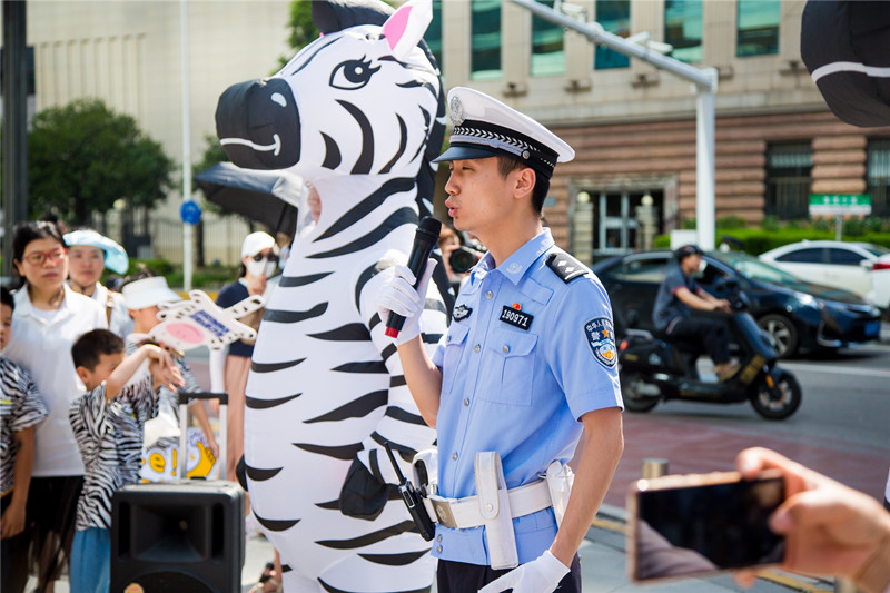 湖南日报·新湖南客户端6月26日讯(记者 刘涛)天气火热,斑马上路,这是到非洲了吗?今天上午,在长沙市中心五一商圈逛街的市民惊奇地发现,在柑子园路口,两只胖墩墩的斑马人偶,在交警护送下,根据交通灯提示一“马”当先,带着一群身着斑马条纹T恤的孩子,随着人行绿灯放行,安全有序的走过斑马线。