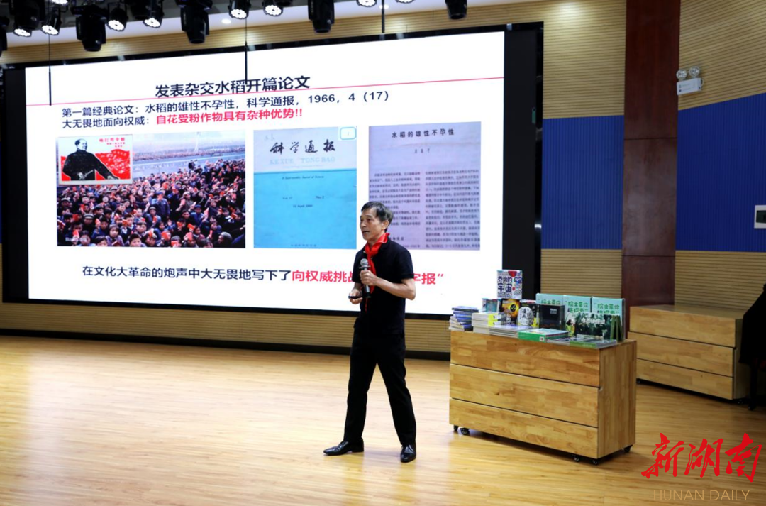 袁隆平院士的一生是不平凡的一生,1953年从西南农学院毕业后,他被分配到湖南湘西山区的农校,成为一名俄语老师,后来因为科学成果被公认为“杂交水稻之父”,获得了由习近平总书记亲自颁发的“共和国勋章”,并在国际上享有盛名。在讲座上,马国辉以“立志与追梦”“挑战与践行”“担当与坚守”三个动人的故事,串联起袁隆平的人生经历,向同学们深入讲述了这份秘诀的内涵。