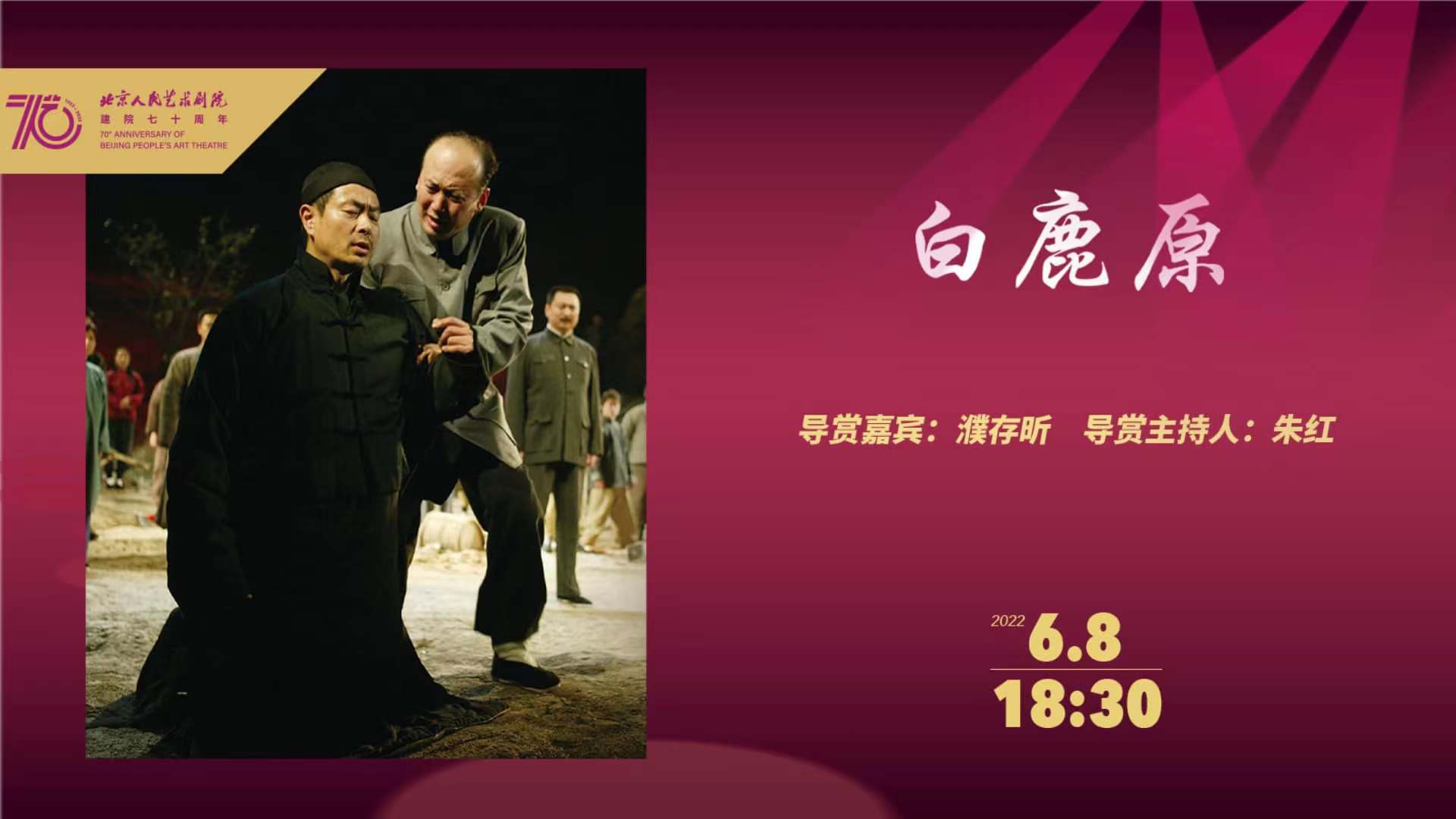 在剧场无法开放的特殊时期,剧组全体人艺演员与特邀主演郭达、老腔、秦腔艺术家全力以赴共同经历了半封闭式的排练,于5月22日在首都剧场进行了4K超高清专场录制,将于今晚首次亮相全网。放映前1小时,主演濮存昕将在线上演播间与主持人朱红对话《白鹿原》,从这部现实主义史诗的舞台化改编,看作品的精神内核和北京人艺融入的创作思考。