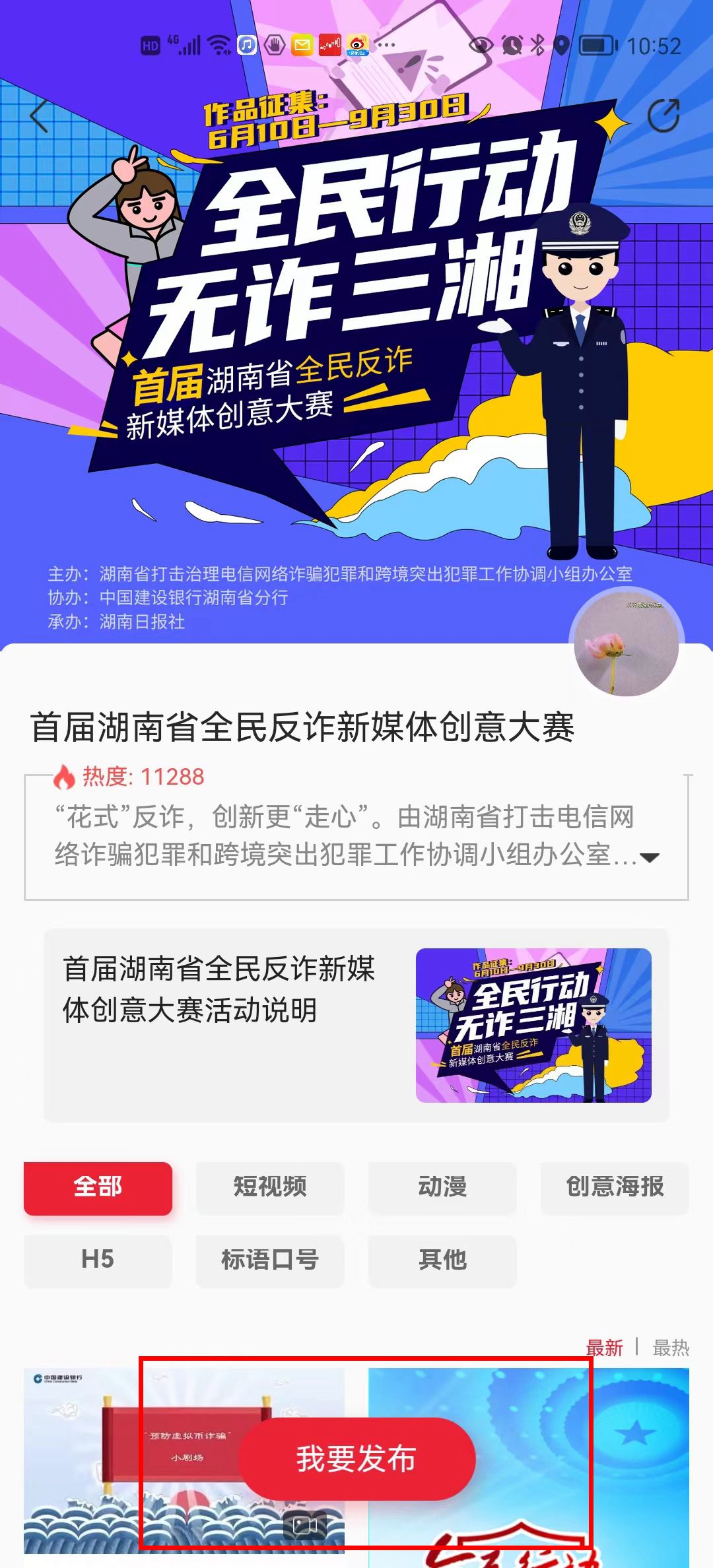 首届湖南省全民反诈新媒体创意大赛分为“高校组”“行业组”“大众组”3个组别,参赛选手可围绕“全民行动 无诈三湘”这一主题,进行短视频、动漫、创意海报、创意H5、创意反诈口号或标语、反诈表情包、反诈LOGO等新媒体产品创意制作。