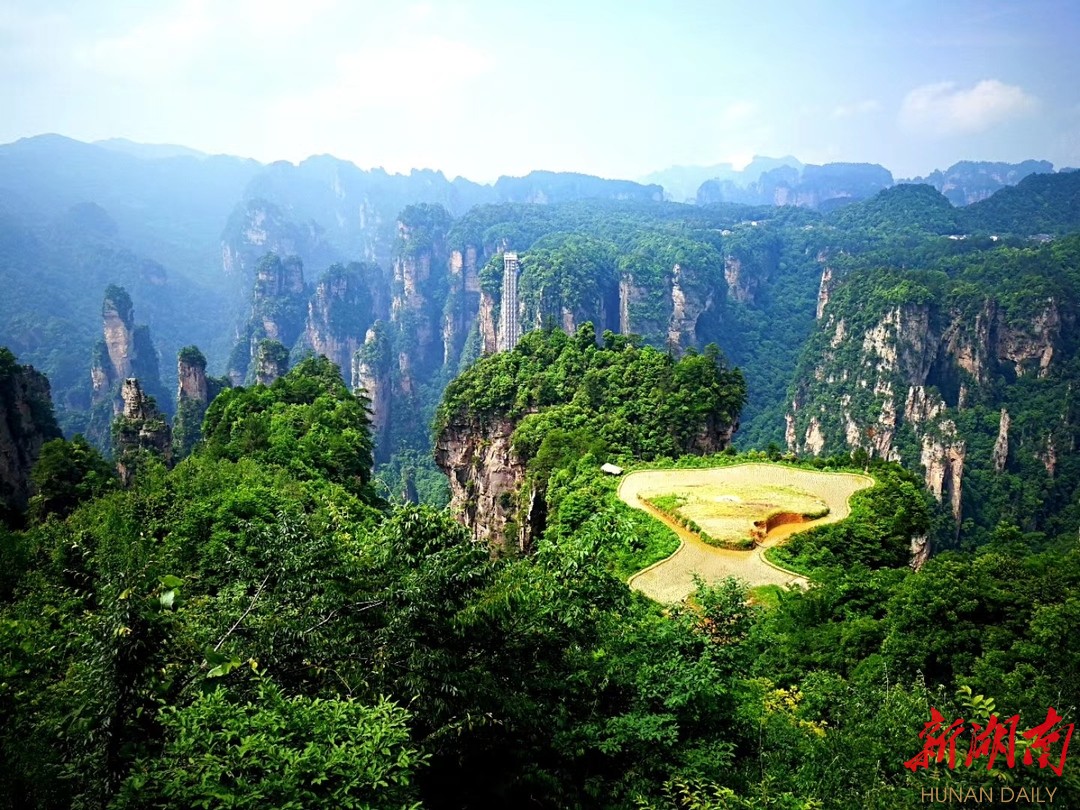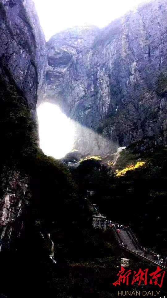 悬崖栈道如龙,四方游客,争睹屏呼吸。万壑深林飞鸟绝,山下车行如蚁。回望天门,洞观尘世,问几多悲喜?澧江依旧,东流不问消息。