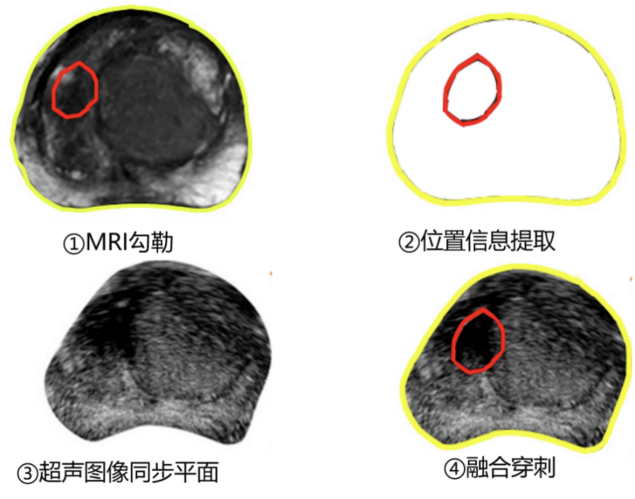此平台主要由超声平台、步进器、融合平台三部分组成(图1)。穿刺的过程主要分为四步(图2):首先把MRI的影像资料导入融合穿刺平台,对每个层面的前列腺轮廓进行勾画(如图2黄色线所示),然后对可疑病灶进行勾画(如图红线所示),然后通过融合软件生成前列腺3D影像模型,确定病灶的位置,类似于“GPS”定位,再把融合平台和超声系统连接,把超声实时显示的前列腺与前一步MRI的轮廓同步,使二者的图像轮廓重叠,最后通过超声引导靶向穿刺红色病灶内的可疑前列腺组织。