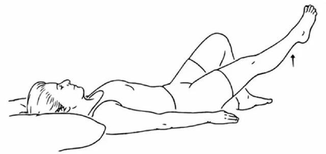 3、直腿抬高训练:膝关节伸直,准备抬高的下肢将脚回勾,缓慢抬起至30°,保持5秒,缓慢下落,更换对侧训练(注意:术侧下肢抬高20°以内);每次30-50下,每次训练15分钟;同时配合呼吸训练,起吸落呼。