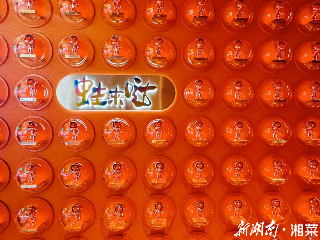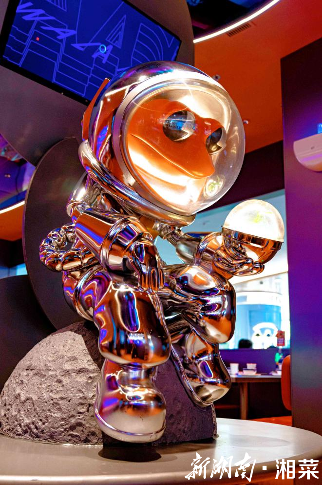 除了小吃、饮品的更新,蛙来哒一直迎合当下年轻人审美的装修风格,从“1.0工业风”到“2.0霓虹幻彩风”到“3.0黑金风”到“4.0闪电风”,而作为品牌升级里极亮眼的地方,在布满太空人雕塑等科技太空元素的装饰下,全新升级的“5.0星球科技风”的惊艳呈现,让食客们争相拍照打卡。“太空蛙”形象与宇宙空间元素的融合,提升了更多的科技感,也体现了蛙来哒“创新、开放”的品牌形象!