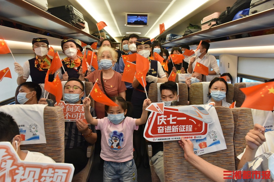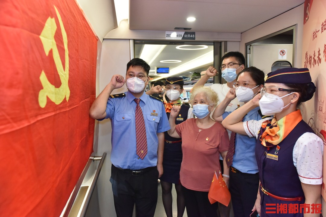 三湘都市报·新湖南客户端6月29日讯 (全媒体记者 卜岚 和婷婷 视频 王珏 通讯员 杨振宇 殷庆 金鑫 徐晖铭 )6月27日下午3时,“‘犇’向未来,智能创新 ”主题列车——G6001次列车正式发车,由长沙南站犇赴深圳北站。车上,长沙客运段高铁动一车队党总支和段团委联合三湘都市报·犇视频开展了一场庆祝建党101周年及香港回归25周年的主题党日活动,与广大旅客朋友一起热议湖南人“敢为人先”的创新之力,感受犇视频见证时代的三牛之力。
