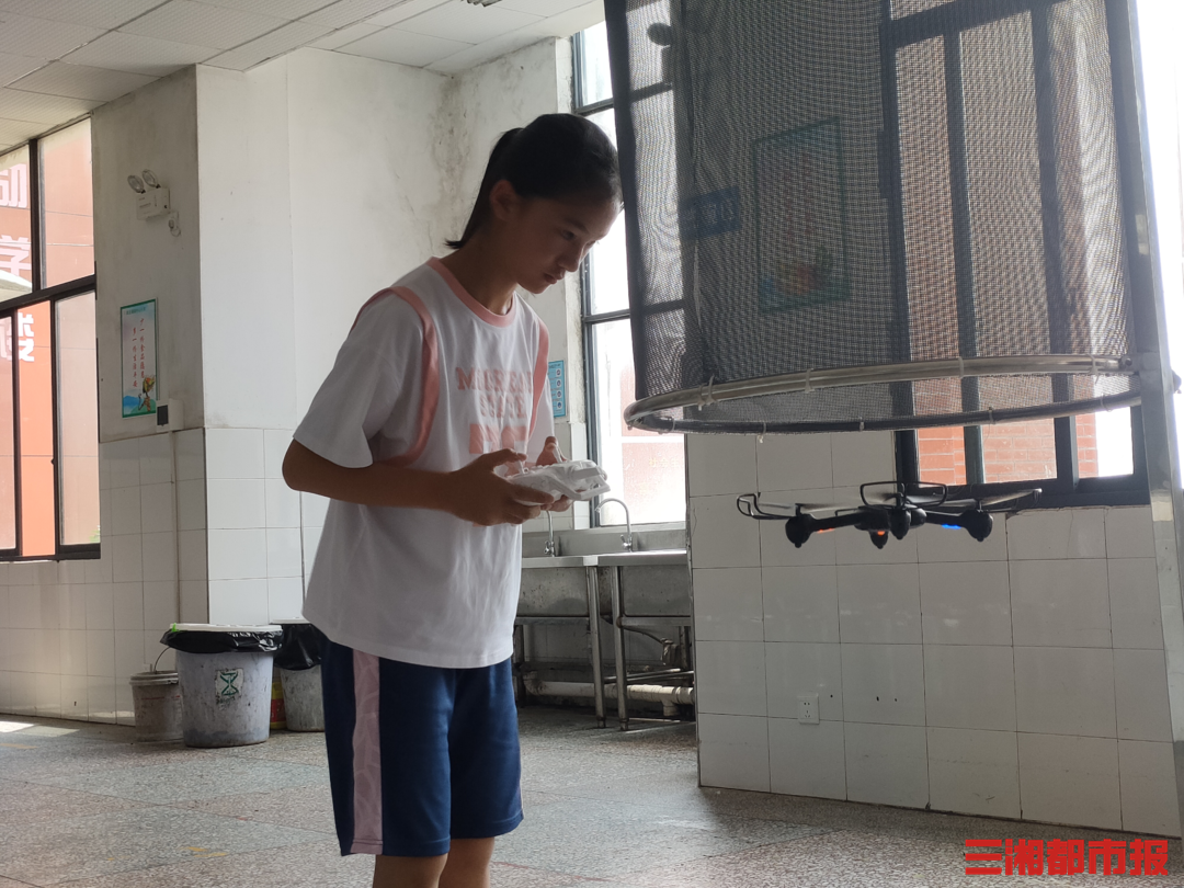 (宁乡回龙铺镇中心小学五年级学生林紫萱,利用课余时间训练飞行无人机。)