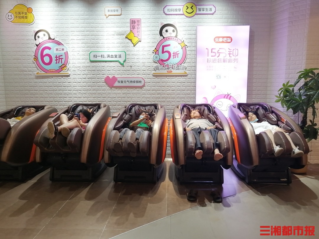 (6月11日,开福区某商场内共享按摩椅上坐满了市民。 )