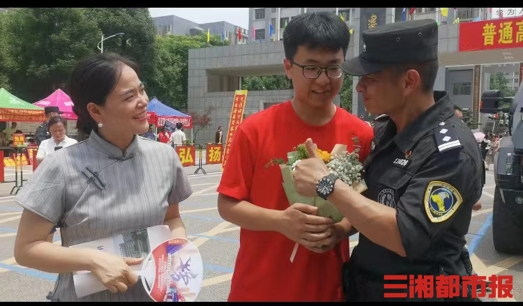 妻子递上早就准备好的鲜花,竖起大拇指为儿子加油打气。龚喆笑着说,为爸爸在考点执勤护考感到自豪。