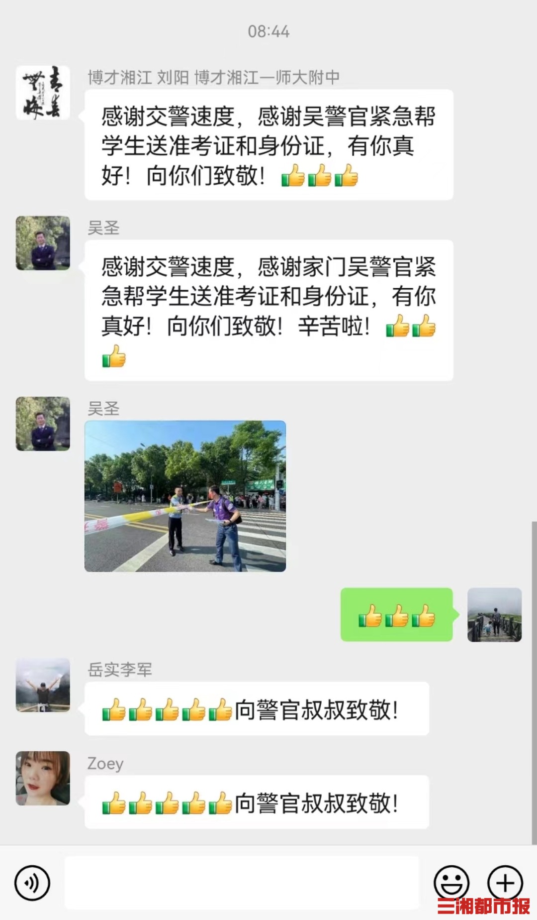 三湘都市报·新湖南客户端6月8日讯(全媒体记者 虢灿 通讯员 袁媚)“谢谢你,吴警官!”今天上午,长沙岳麓交警八中队吴康收到来自多位老师的感谢,他帮一位考生赶在开考前取回了遗忘的证件。