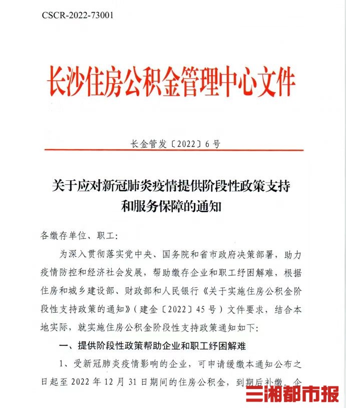 三湘都市报·新湖南客户端6月7日讯(全媒体记者 卜岚 通讯员 赵洁)今日,记者从长沙住房公积金管理中心获悉,《关于应对新冠肺炎疫情提供阶段性政策支持和服务保障的通知》(以下简称《通知》)已于近日发布。《通知》明确,受疫情影响的职工,即日起至2022年12月31日期间,不能正常偿还住房公积金贷款的,不做逾期处理、免收罚息,已扣部分将退回至主借款人还款卡。
