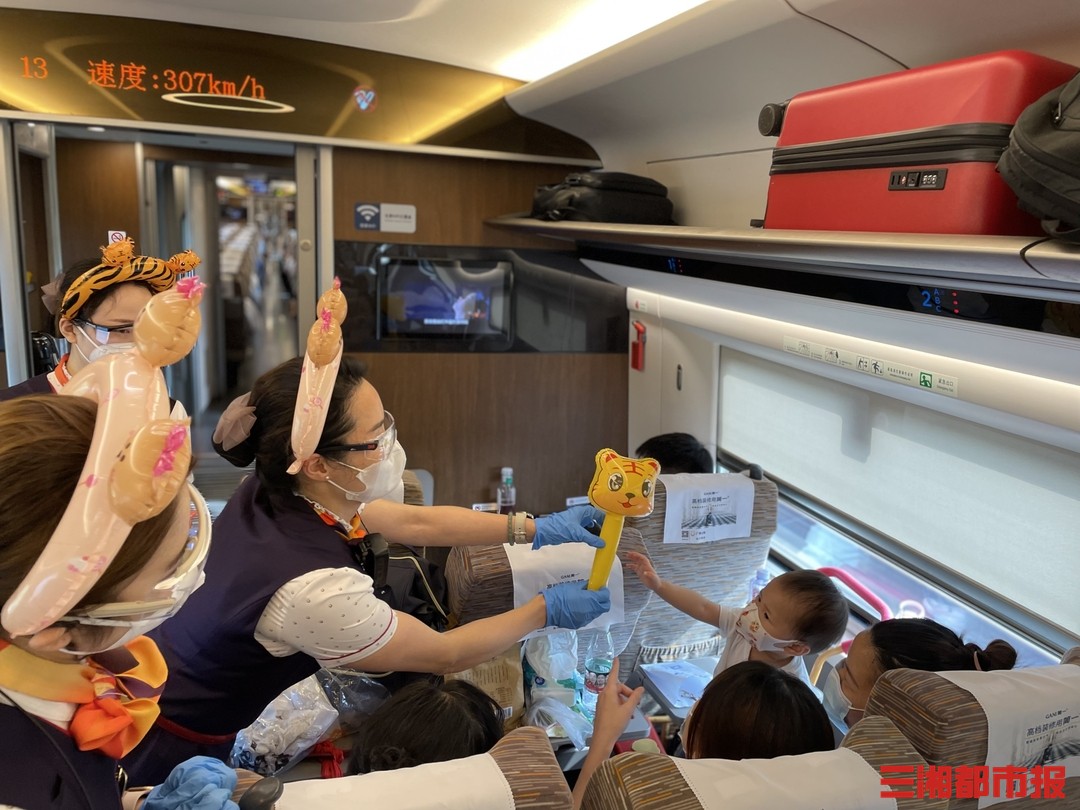 三湘都市报·新湖南客户端6月1日讯(全媒体记者 和婷婷 通讯员 殷庆 杨振宇)5月31日下午,从长沙南开往深圳北站的G6001次列车内传来阵阵笑语。为迎接国际“六一”儿童节和中国传统佳节“端午”,长沙客运段高铁动一车队“和为贵”班组特意开展了一场“艾意相随,伴您童行”复兴号上送祝福活动。