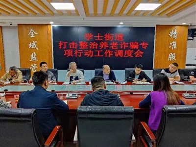 学士、含浦、梅溪湖等街道(镇)、成员单位多次召开打击整治养老诈骗专项行动工作调度会、推动会,统一思想,进行安排部署,推进宣传工作。今年4月以来,区委政法委组织31个成员单位专题部署打击整治养老诈骗专项行动以及专项行动宣传工作。5月,区委政法委结合防范和打击非法集资工作调度会议,两次对养老领域非法集资排查、整治、宣传提出具体要求。在前期成立工作领导小组的基础上,由区委政法委牵头,进一步明确各单位打击整治养老诈骗专项行动宣传工作职责,确保各方宣传工作有条不紊、形成强大合力。