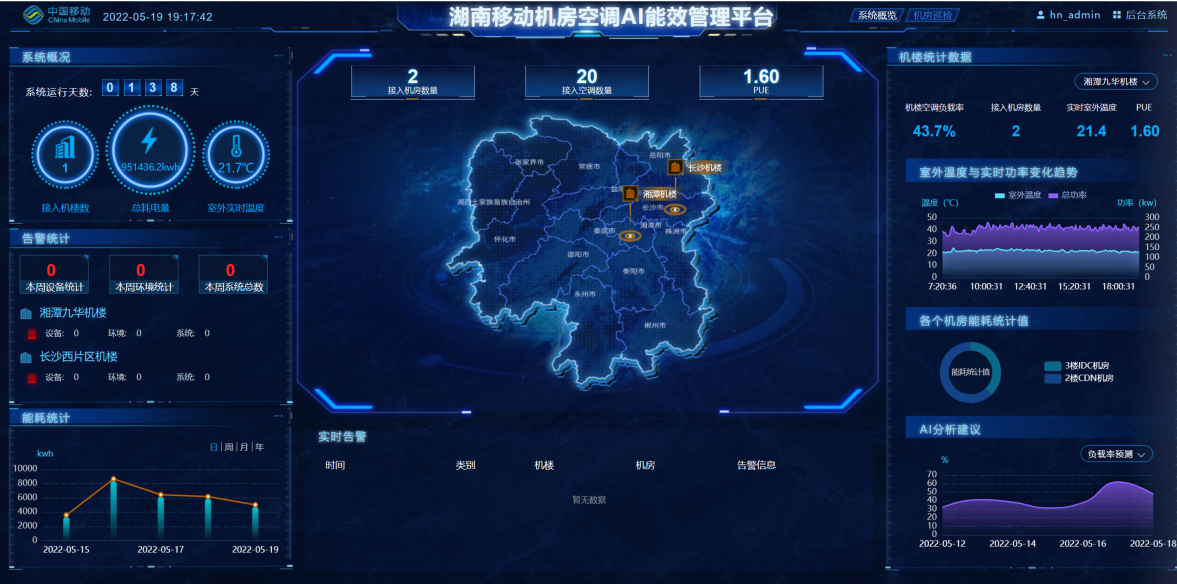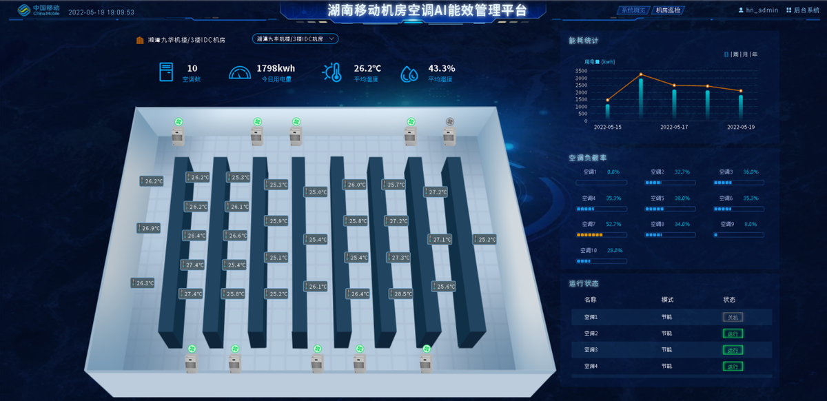数据中心能耗分布中机房空调占比多少?如何通过评估及优化机房空调能效实现机房节能减排?近年来,湖南移动在网管系统中加入基于AI算法的机房空调能效管理模块,构建了面向风冷精密空调机房制冷、用冷、能耗的全方位智能化管理能力,在机房精准节能这个环节前进了一大步。