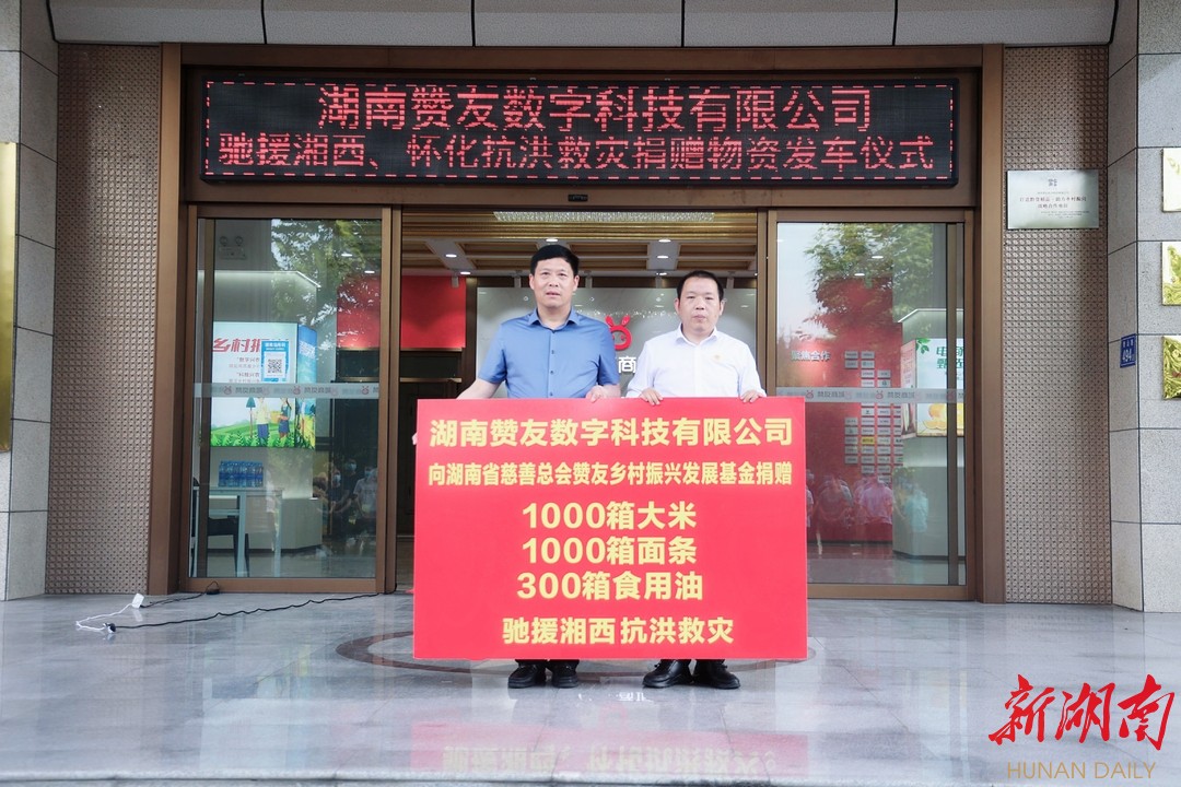 湖南赞友数字科技有限公司第一时间响应湖南省慈善总会倡议,通过湖南省慈善总会向湘西受灾地区捐赠大米1000件、面条1000件、食用油300件,支持泸溪县、凤凰县等受灾地区防汛救灾。
