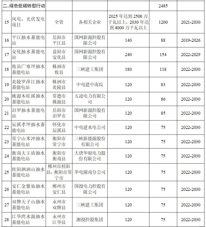三、抽水蓄能规模化建设工程。抽水蓄能是当前技术最成熟、经济性最优、最具大规模开发条件的电力系统绿色低碳清洁灵活调节电源,加快发展抽水蓄能,是建设以新型能源为主体的电力支撑体系的内在要求。重点推进安化抽水蓄能电站,工程位于益阳市安化县仙溪镇,装机容量为240(8×30)万千瓦,总投资154亿元。目前,工程各项前期工作进展顺利,正按照2022年6月份完成项目核准并开工建设的目标加快推进,计划2029年建成投产。工程建成后,将大幅提升全省新能源的消纳能力。同时,加快平江抽水蓄能电站建设,争取2025年投产1台机组、2026年全部投产。积极推进已纳入国家抽水蓄能中长期规划,“十四五”重点实施的攸县广寒坪、炎陵罗萍江、桃源木旺溪、汨罗等12个抽水蓄能电站前期工作,力争2022年内全部核准启动建设,到2030年全省抽水蓄能装机达到2000万千瓦。