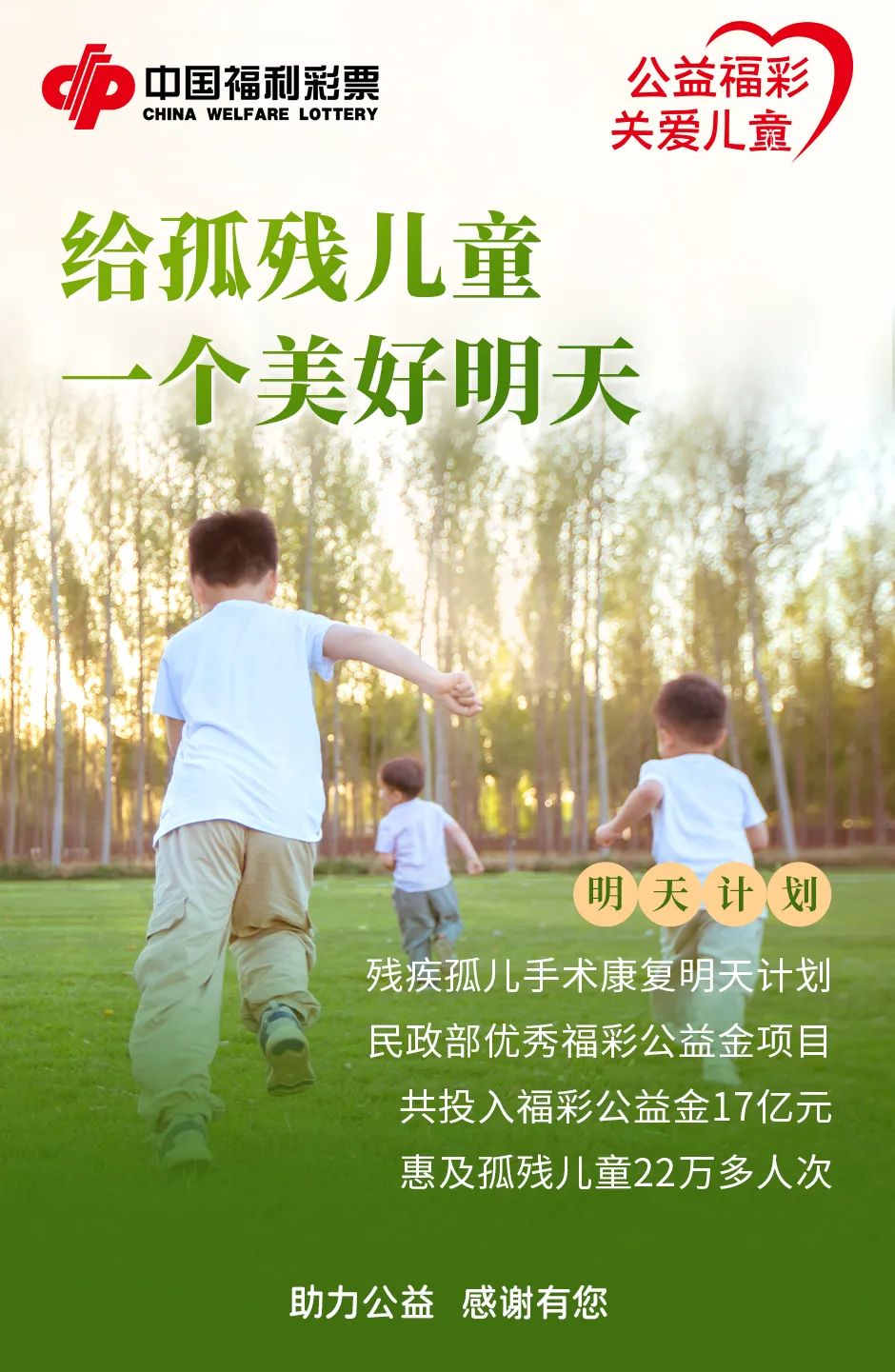 儿童是祖国的花朵,儿童是未来的希望,但是一旦失去父母呵护的羽翼,便成了离开雁群的风中雏雁,不知乡关何处,不知家归何方。我们奋斗在美好生活的路上,总有不少失去父母的孤儿,总有不少罹患各种病症的儿童,他们无助,期待关爱;他们羸弱,需要温暖。孤残儿童的明天在哪里?困境儿童的希望在哪里?在党和国家的关怀里,在社会各界的关心里,在数亿购彩者的关爱里,在数十万福彩从业者的关爱里,在全国人民的关爱里。