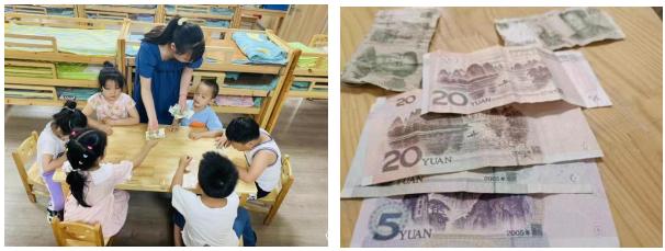 猜猜摘下的蔬菜都到哪儿去了呢?别着急!让我们一起来看看,小朋友们纷纷把蔬菜送到了“菜店”那里……为了更好的完成销售工作,大班的孩子在老师的带领下提前学习货币知识活动,认识不同数额的硬币、纸币,理解“元”和“角”的概念。