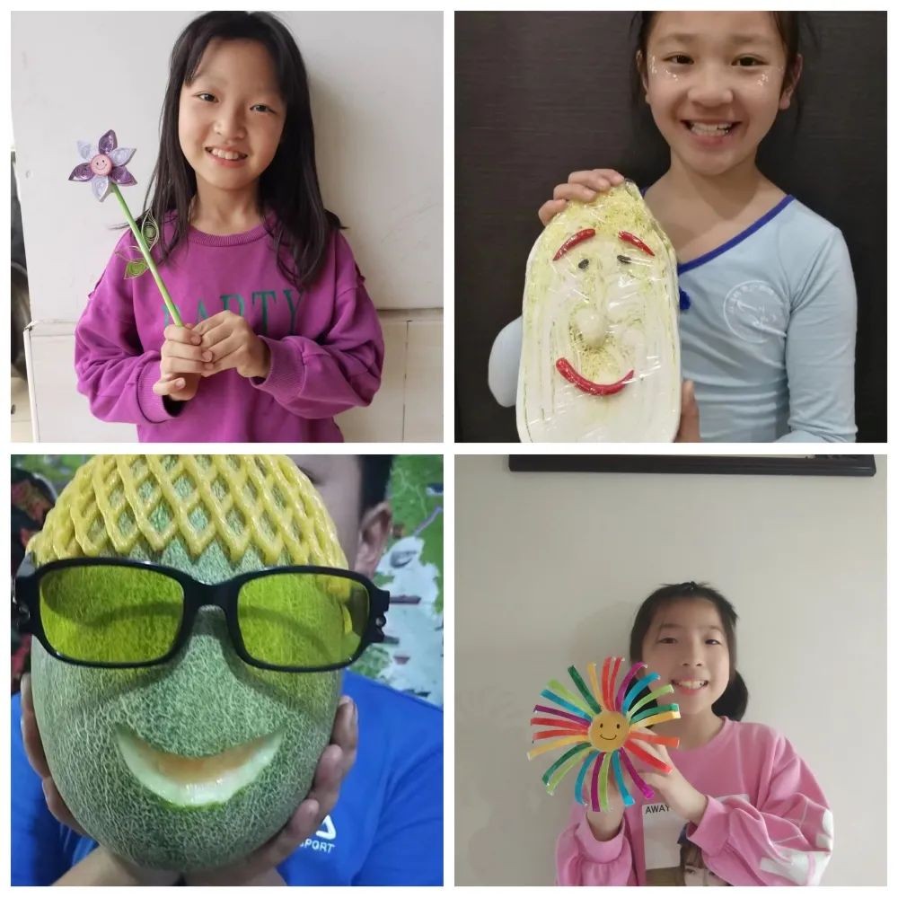 三年级同学开展“魅力微笑”照片征集,四年级组开展了“微笑创意”活动。孩子们利用身边的物品,发挥自己的想象力、创造力,制作出各种可爱的笑脸,并与作品合影。