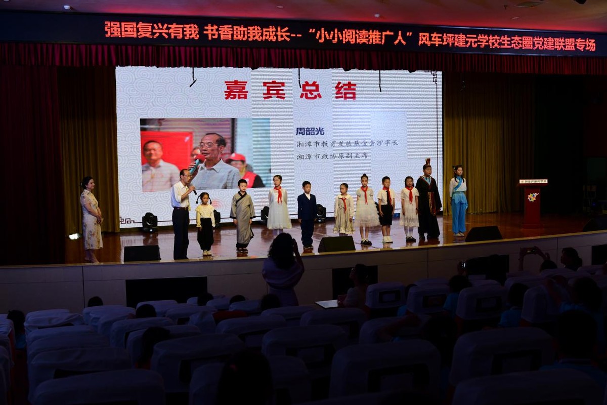 这是莲城读书会第362场线下活动,本活动由湘潭市教育发展基金会、湖南教育报刊集团、湘潭市全民阅读协会、莲城读书会联合主办。湘潭市教育发展基金会理事长、湘潭市政协原副主席周韶光,湘潭市教育发展基金会副理事长张晋安,湘潭市全民阅读协会会长、莲城读书会创始人欧阳姿,风车坪建元学校生态圈党建联盟各校的校长、书记以及风车坪建元学校生态圈300余名师生参加了此次活动。本场活动的主持人是风车坪建元学校的贺玉辉老师。