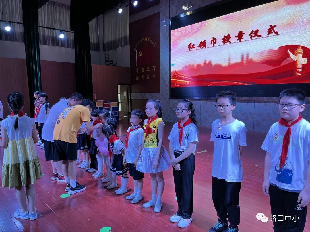 在雄壮有力的出旗曲中,旗手们踏着铿锵有力的步伐、高举队旗徐徐入场,少先队员们目视着中国少年先锋队队旗。这如火的旗帜,点燃了少先队员们的热情。紧接着,全场高唱《中国少年先锋队队歌》,老队员为新队员系上红领巾,鲜艳的红领巾在胸前迎风飘扬,嘹亮的宣誓声在火红的队旗下久久回荡。