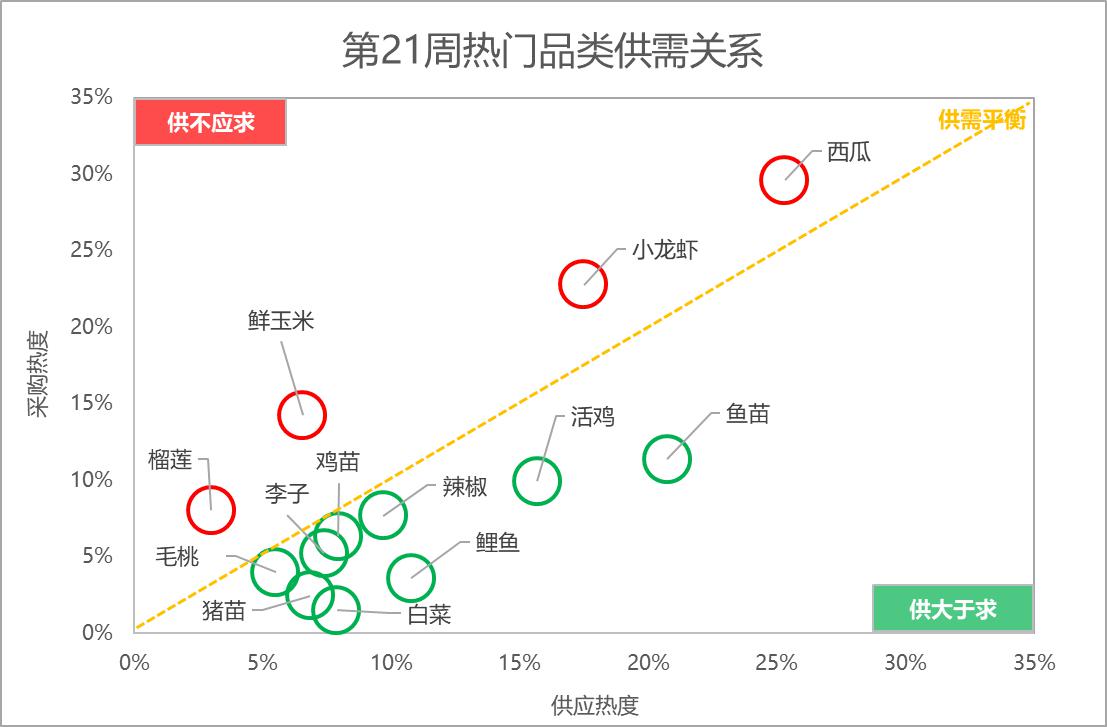 分析惠农网平台热门品类的供需关系:西瓜、小龙虾、鲜玉米和榴莲等的供应相对偏紧;鱼苗、活鸡、辣椒、鲤鱼、鸡苗、李子、白菜、猪苗和毛桃等的供应相对充足。
