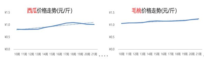 第21周,毛桃均价为1.2元/斤,较上周价格上涨2%,已实现5周连涨。毛桃自上市起行情整体维持在1.2元/斤区间稳步增长。