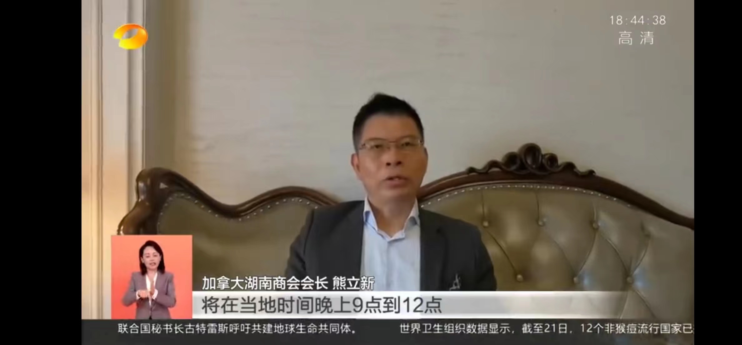 在第十届全球湘商大会期间,湖南异地商会联合会执行会长、加拿大湖南商会会长熊立新接受湖南卫视新闻联播采访时表示,此次全球湘商大会设立了150多个海内外的分会场。此举扩大了全球湘商大会的全球性影响,同时也是落实疫情防控条件下举办大型会议的创新举措。加拿大湖南商会积极响应大会号召,组织了30多名商会成员,在加拿大设立了分会场,他们在当地时间的晚上九点到12点收看大会盛况,为家乡的经济建设加油鼓劲!