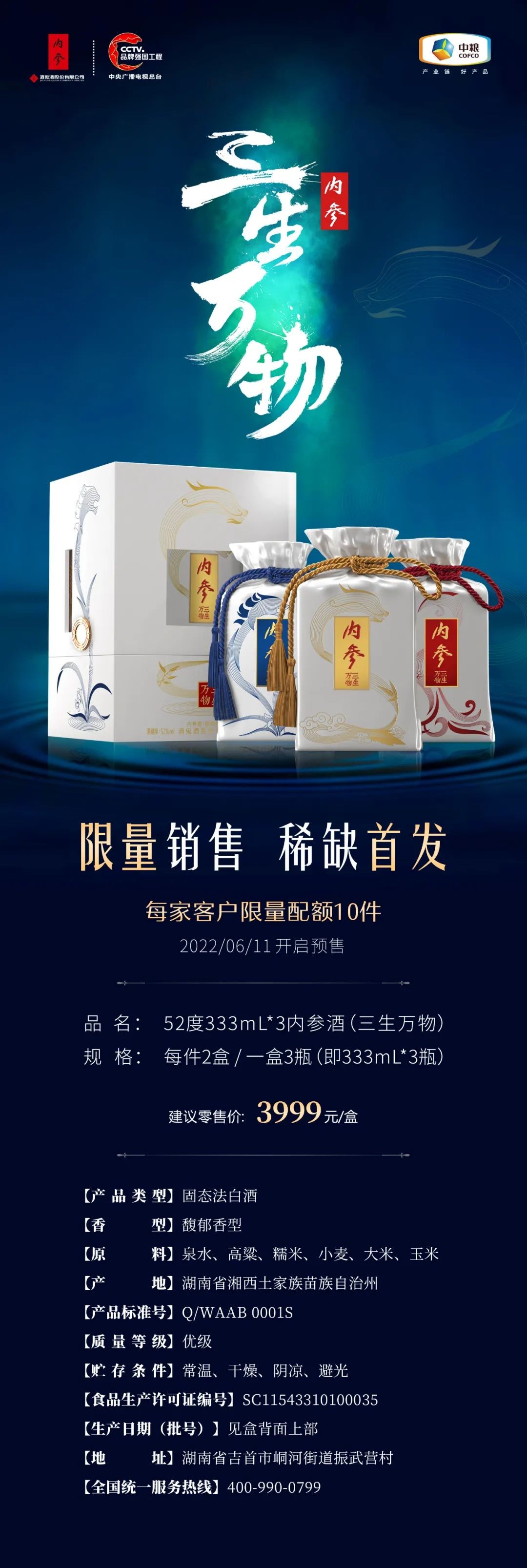 通过科技的力量,新潮艺术的力量,极具文化内涵的内参酒在引领高端文化白酒的风潮中,将展现自身独特的品牌魅力。内参酒•三生万物自6月11日起,已面向全国合作伙伴开启预售。每个客户配额限10件,一件2盒,一盒3瓶,每瓶333mL。产品零售指导价3999元/盒。