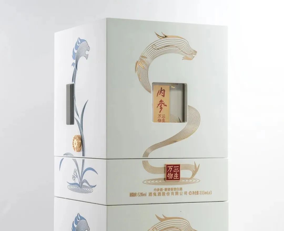 在品牌包装设计上,内参·三生万物有着突破常规的表达。产品采用四方外形,顶部压印圆形两仪图案,寓意天圆地方。纯白盒身之上以红、黄、蓝三原色为点缀,盒外龙、凤、兽插画与内瓶呼应,对应酒鬼酒的取水源头“龙凤兽”三泉。瓶身白如凝脂,温润如玉,沿用内参经典造型,其333mLX3的规格意味更不言自明。