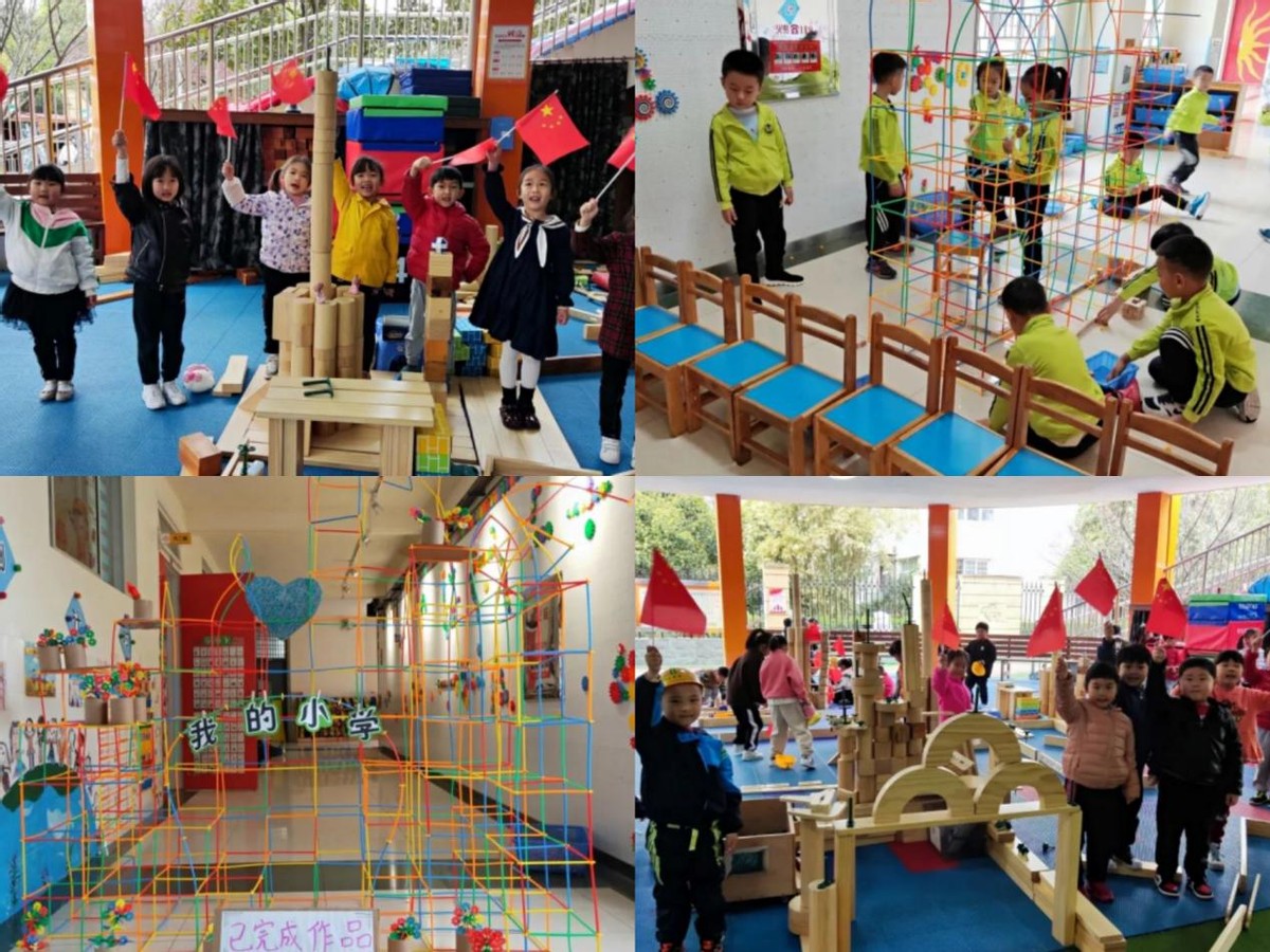 随后是建小学。在建构游戏中,孩子们或独自搭建、或小组分工合作搭建着自己心中的小学。