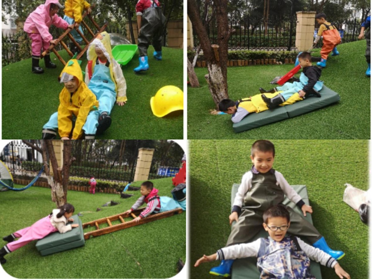 小山坡上的滑草游戏除了滑草板,还有哪些材料可以用于滑草呢?儿童通过观察滑草板的特点,联系生活经验,收集游戏材料,再逐一进行滑行体验。尝试不同坡度、不同材质、是否合作、材料组合灯多种形式,在反复探究中发现事物间的规律。