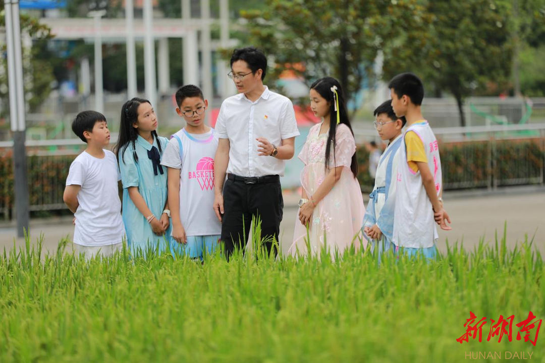 在新时代劳动教育的实施过程中,学校在积极创造劳动教育环境时,也要充分结合当地及学校的实际情况来开展。昭山和平小学经过科学筹划,在校园内开辟了“三园一馆”(即蔬果园、瓜薯园、农耕园和民俗馆)作为劳动教育实施的主要场所。其中种植水稻的农耕园已成为学校“网红”打卡地。谷雨时节,六年级的孩子们亲手将秧苗插入田中,之后校园里的每个孩子都成了水稻护理员。科学组、美术组的老师们带领团队开展项目化学习和多学科融合探究,让农耕文化在这里得到传承与发扬,将爱劳动的种子深深扎入了孩子们的心底。
