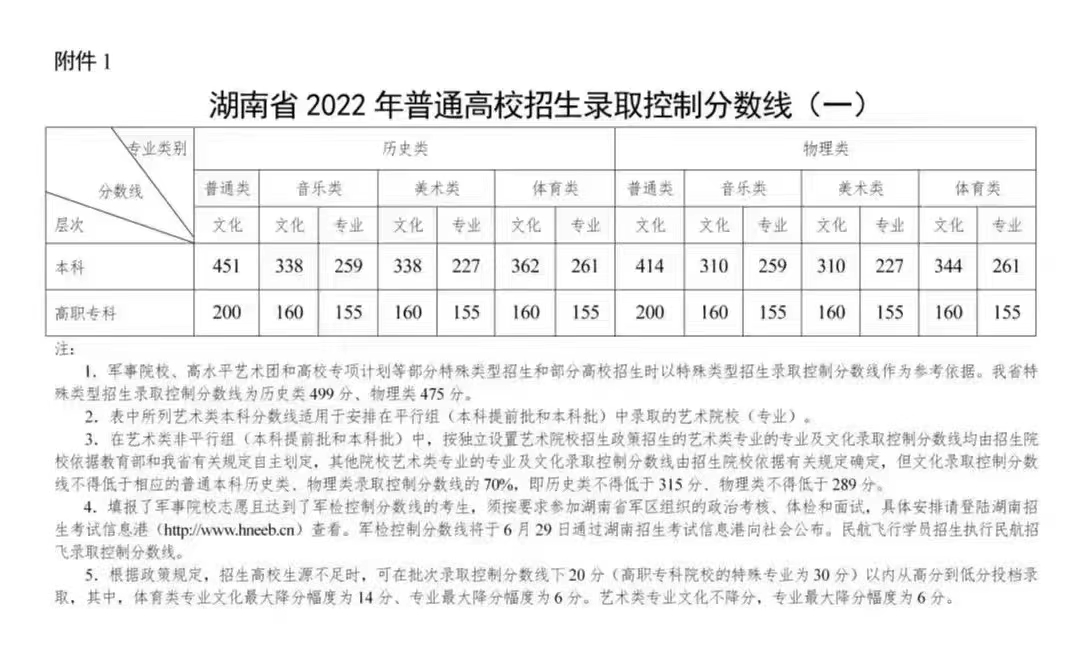 本科批历史类451分,本科批物理类414 分!2022年湖南省高考录取分数线公布