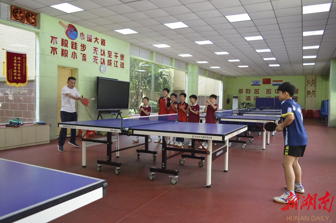 在学校乒乓球馆内,几十个孩子正全神贯注地挥着球拍,时而一个上旋,时而一个抽杀,小小的兵乓球在桌上来回穿梭……“这些都是学校乒乓球队和社团的孩子,他们每天中午都会在这里训练。”杨朗就是学校乒乓球队的一员。他告诉记者,打了几年乒乓球,自己的心态也变好了,以前输了比赛会哭鼻子,但后来想通了———要用学习的心态去比赛,输赢无所谓,在参赛的过程中收获经验和成长才最重要。