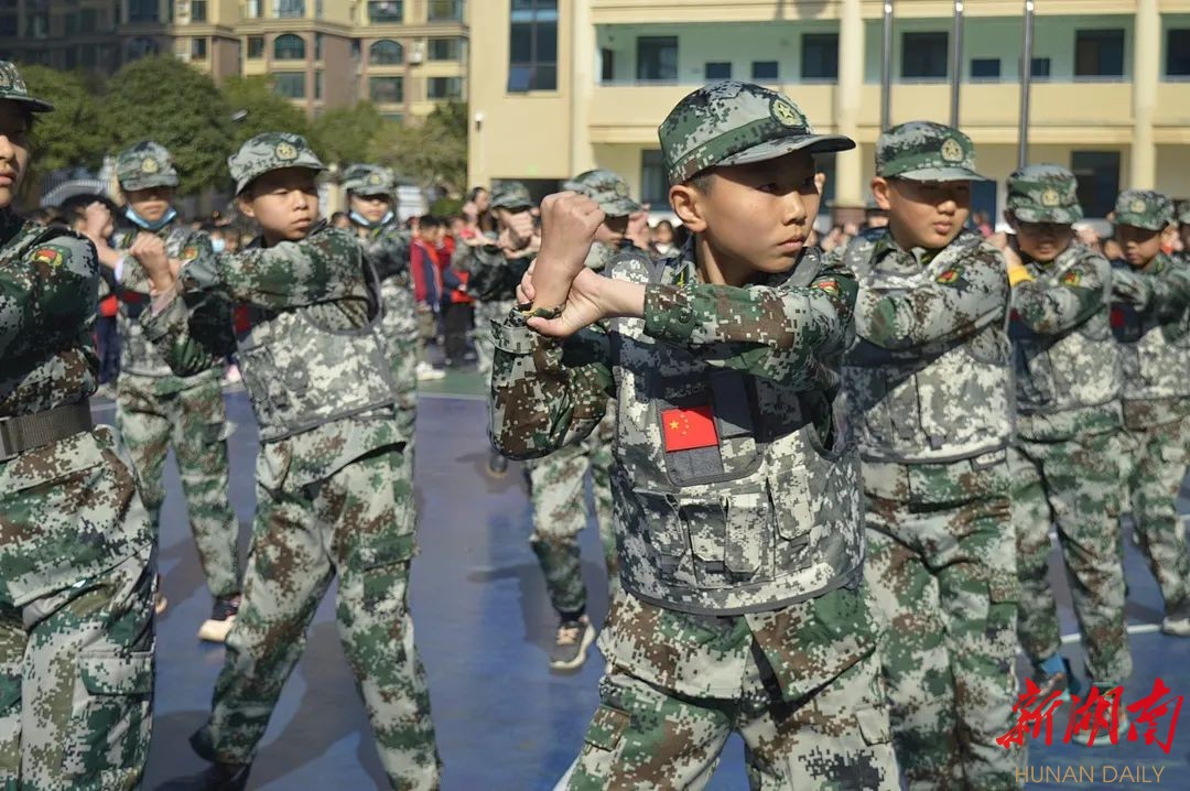 为了做好国防教育,在吴安华的牵头下,学校成立了国防教育领导小组。邀请望城区人武部领导、区教育局领导担任顾问,为国防教育配备优秀专职军事教官。专职军事教官与学生同学习、同训练、同娱乐,实施准军事化管理。把国防特色教育纳入课程体系,定期开展常规军事训练,组建国旗护卫队、军事技能展演队,并在校外国防基地开展新兵训练营体验活动。6月2日下午,记者在中岭小学看到,伴随着嘹亮的《强军战歌》和口令,学生们分别开展了队列、匕首操训练。立正、稍息、报数、跨立、停止间转法……学生们对各个动作要领都十分熟练。