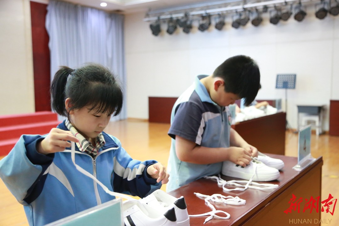 一、二年级的选手们在多功能厅展开了系鞋带比赛。小可爱们那一双双巧手,如穿针引线般地将鞋带从一个个洞中穿插而过,最后再以一个蝴蝶结完美收官,过程流畅自然,手法娴熟到位。