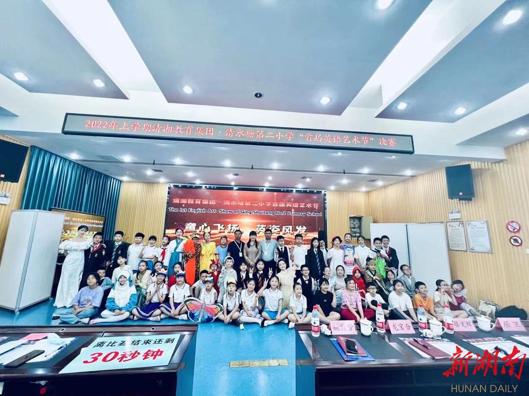 科教新报·新湖南客户端讯 (通讯员 王灵君 罗静)为进一步激发学生学习英语的兴趣,提高学生的英语综合语言运用能力,培养学生英语核心素养,展示在“双减”之下学校英语教育教学成果,6月8日上午,长沙市开福区清水塘第二小学首届英语艺术节活动在该校多媒体教室成功举行。学校两位挂职副校长——湘西凤凰新场学校校长龙宝合、怀化新晃米贝苗族学校校长姚敦赞,以及清水塘第二小学校长骆文辉、副校长屈卫参加了此次活动。