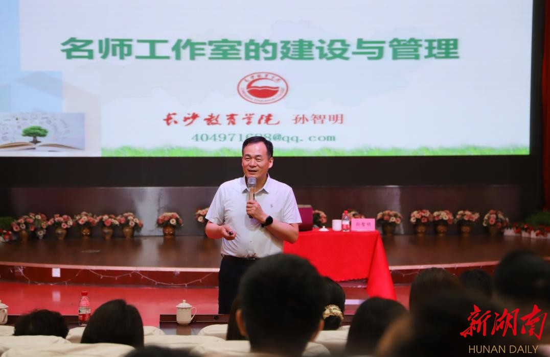 活动第二阶段,长沙市教育学院孙智明院长以《名师工作室的建设与管理》为题进行专题讲座。他从名师工作室的意义与使命、名师工作室的职责与要求、名师工作室的理念与方法三个方面进行阐述。他强调,教师是教育的第一资源,激励所有团队成员善于学习、精于上课、勤于写作。孙智明认为,名师工作室的职能定位为教师专业成长的集中营,区域学科建设的带头人,名师工作室的主要任务为培养未来教育家、研讨教育教学问题和推广教育教学成果、开发教育教学资源、引领学科发展,并明确了名师工作室、名师工作室团队及学员的职责与要求,分享了名师工作室的理念与方法,包括适应性专长理论、认知学徒制理论和主体简性理论。孙院长的讲座,通过生动的案例,理论与实践相结合,对名师工作室的建设与管理,有很强的针对性、前瞻性和指导性。