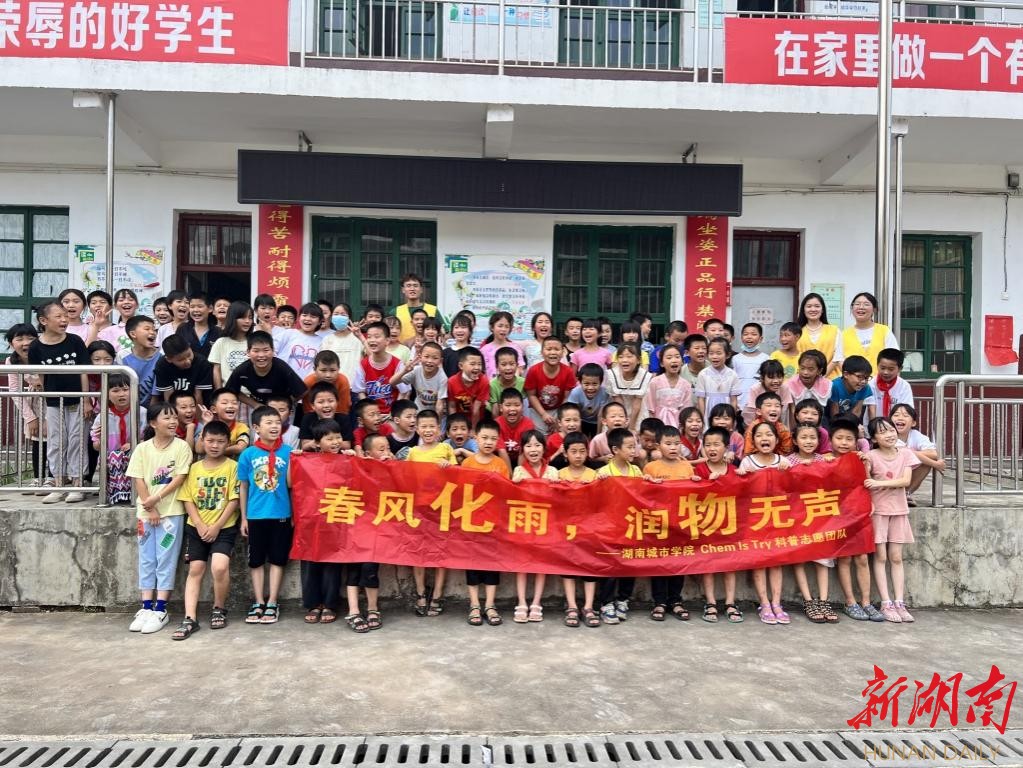 新湖南客户端6月28日讯(通讯员 李思思)在“双减”背景下,为了发展孩子们的思维,锻炼学生的实践能力,激发孩子的科学探索精神,6月27日下午,湖南城市学院三位优秀在校大学生来到了双峰县荷叶镇新耀学校,为孩子们送上了精彩的“趣味小实验,科学大发现”探究活动课,活动取得了圆满成功。