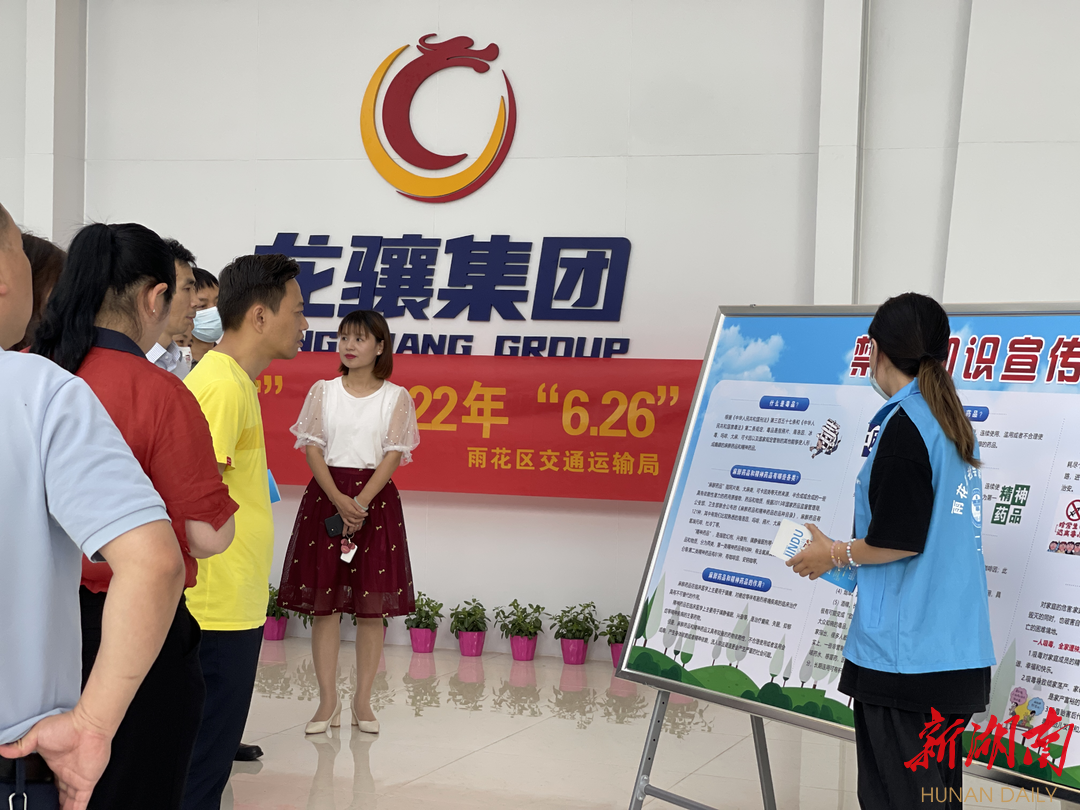 湖南日报·新湖南客户端6月21日讯(通讯员 王棋)在第35个“6·26”国际禁毒日即将到来之际,长沙市雨花区井湾子街道赤岗岭社区今天联合区交通运输局、井湾子街道公共安全办在湖南龙骧交通发展集团有限责任公司开展了“禁毒宣传进万家”为主题的禁毒宣传活动。活动现场以安全知识展板块、禁毒知识展板块、悬挂禁毒宣传标语的形式向公司员工、驾驶员们、居民群众进行宣传。