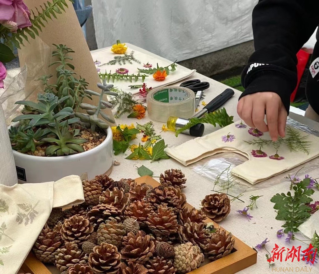 C2131班的汤子慧同学从小就喜欢栽花种草,考入长沙财经学校服装设计班后,将自己的业余爱好植物拓印带到了毕业班同学的秀场;滕湘玲和肖慧玲同学,也带来了自己喜欢的手工扎染,供大家现场体验。大自然的美,激发着学生敏锐的感知能力,享受着艺术创造的乐趣。