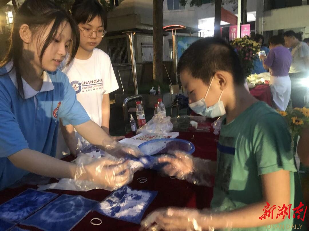 湖南日报·新湖南客户端6月30日讯(记者 李文耀)六岁的胡吉睿在腾湘玲姐姐的帮助下,做出了自己人生第一块扎染小手帕,开心得不得了。昨晚,长沙财经学校2020届毕业生服装设计成果汇报展在荷花池校区操场举行,精致高雅的时尚服装秀和饱含生活气息的扎染、植物拓印、爱衣修改缝补,吸引了不少市民前来围观。