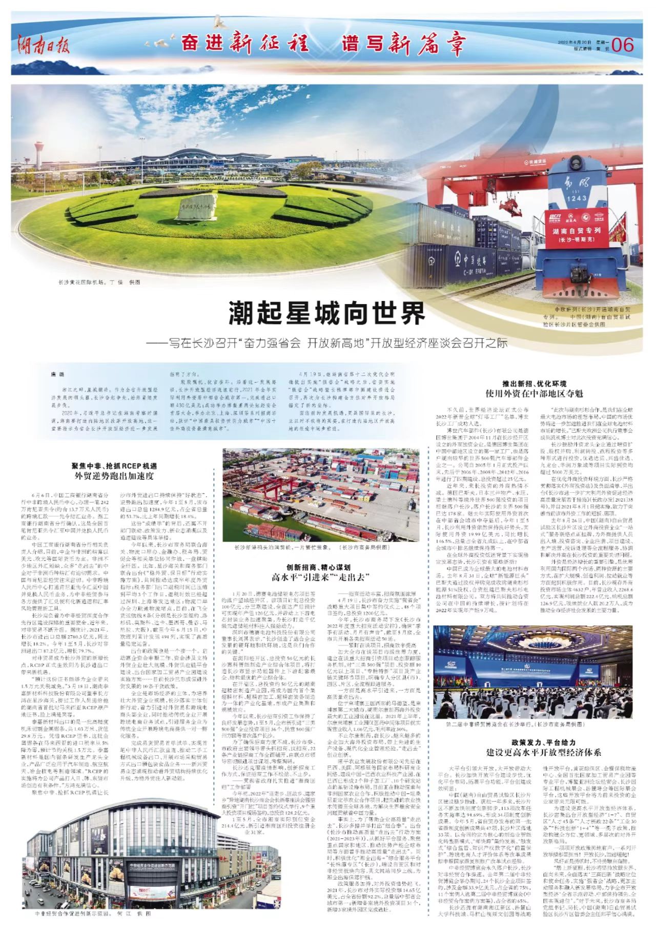 “踏上新征程,长沙将坚持放眼世界、面向未来,全面落实‘三高四新’战略定位和使命任务,实施‘强省会’战略,更加主动服务和融入新发展格局,力争全市开放型经济‘全省示范带动、中部保持领先、全国实现进位’。”对于未来,长沙市商务局党组书记、局长,中国(湖南)自由贸易试验区长沙片区管委会主任郑平信心满满。
