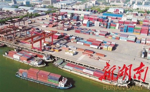 (长沙新港码头泊满货轮,一片繁忙景象。(长沙市商务局供图))