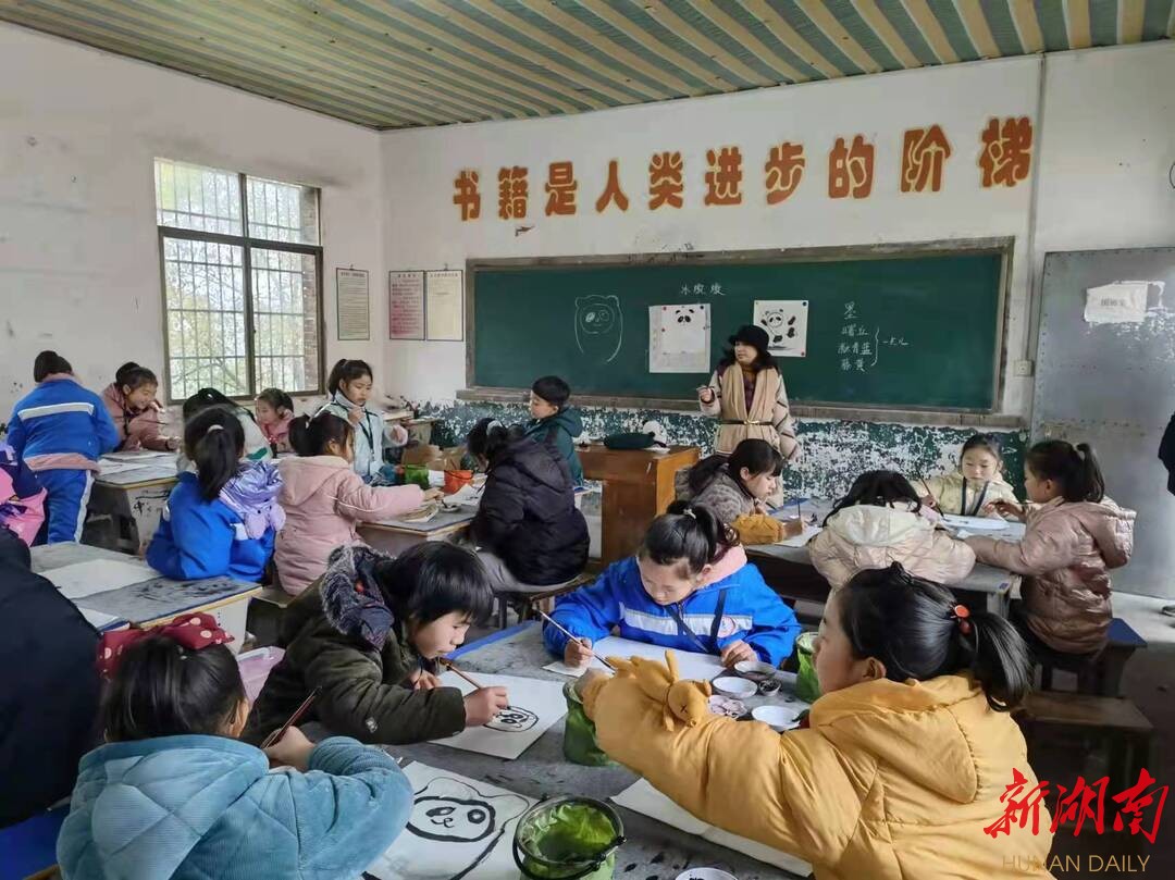△为了培养留守儿童的艺术兴趣和综合素养,向阳联合学校向阳小学校区按照“学生自愿、教师自愿”和公益普惠原则,实施课后服务延伸,图为国画课上留守儿童们在绘制“冰墩墩”