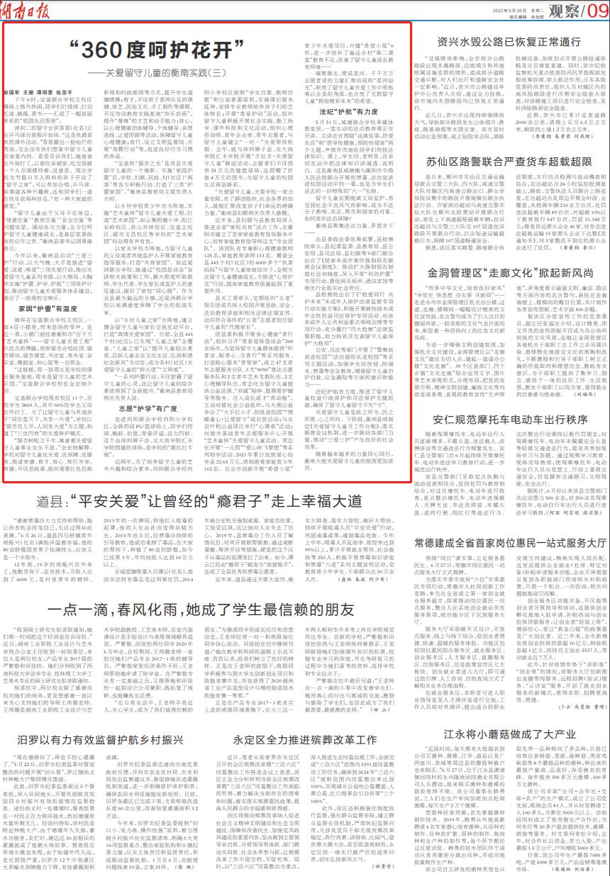 “留守儿童由于父母不在身边,‘情感空巢’‘教育空巢’‘安全空巢’等问题突显。调动各方力量,全方位呵护留守儿童健康成长,是基层党委政府的应尽之责。”衡南县委书记胡果雄表示。