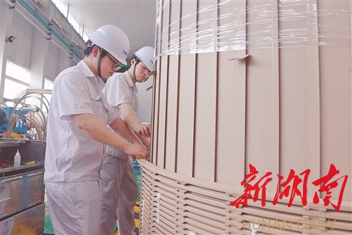 △5月13日,特变电工衡阳变压器有限公司线圈车间,技术工人对变压器核心部件——“铁芯”柱包裹线圈。湖南日报全媒体记者 徐行 通讯员 马松伟 摄影报道