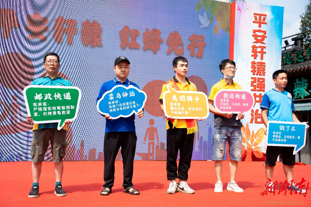活动以“党建+文旅”“党建+安全”为主线贯穿全程,通过党建引领基层治理,启动“红蜂能量吧”子品牌。活动现场,辖区快递、外卖团队站点代表成立“红蜂帮帮团”,共同倡议安全生产,遵守法规制度、杜绝飞线充电、拒绝快速骑车、远离毒品等,并郑重签下安全承诺。现场,开福区社会禁毒协会通泰街分会会长熊晓峰通过微宣讲形式,宣传禁毒知识,社区文艺志愿者也通过小品表演,号召大家共同参与禁毒行动。