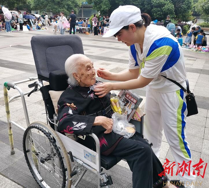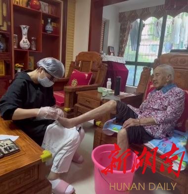 6月8日下午3时,家住长沙市天心区桂花坪街道银桂苑社区银桂小区的程宝贵正在给婆婆刘凤维擦洗。洗脸、擦洗身体、换衣服、泡脚……只见程宝贵娴熟地忙碌着,半个小时后,老人出现在众人前,已经是上身红花衣、下身咖色裤,一头白发往后面梳着,十分干净。今年92岁的老人显得精神矍铄。