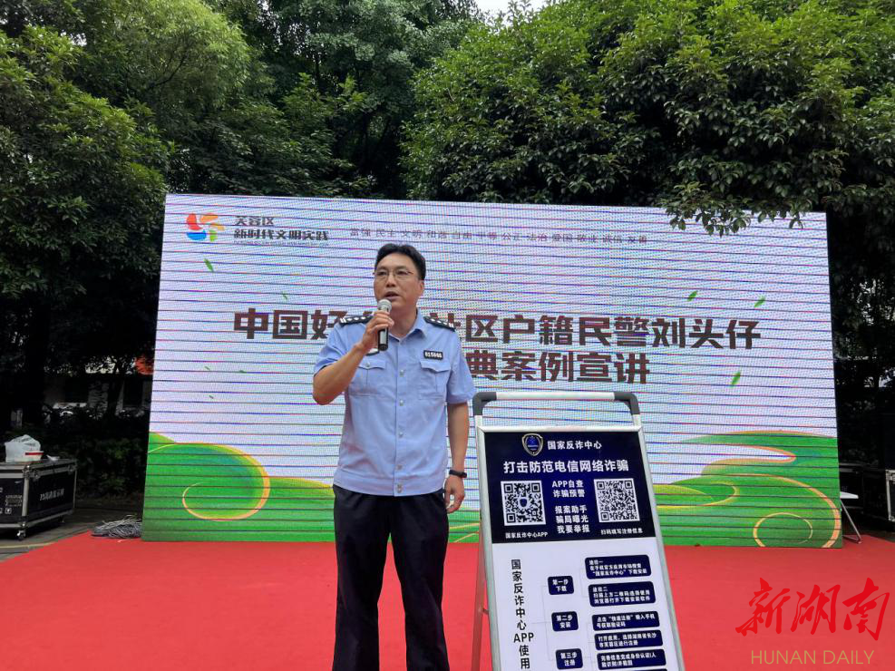 新湖南客户端6月1日讯(通讯员 胡俏枝)5月30日,在长沙市芙蓉区东屯渡街道扬帆社区端午节廉政文化主题活动舞台上,一位民警正在娓娓讲述一位娭毑的故事,他就是“中国好人”、扬帆社区户籍民警刘头仔。